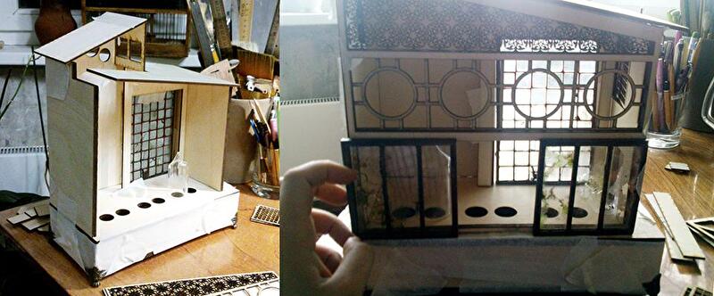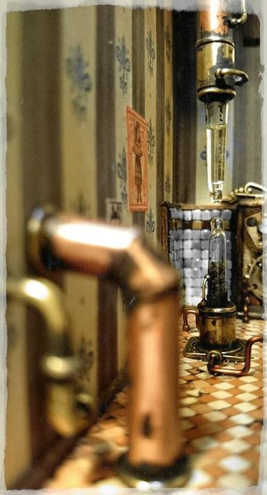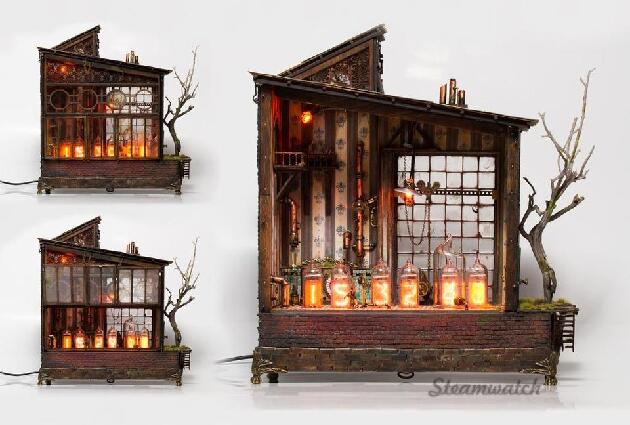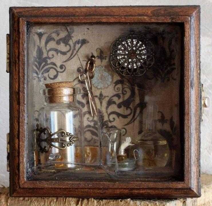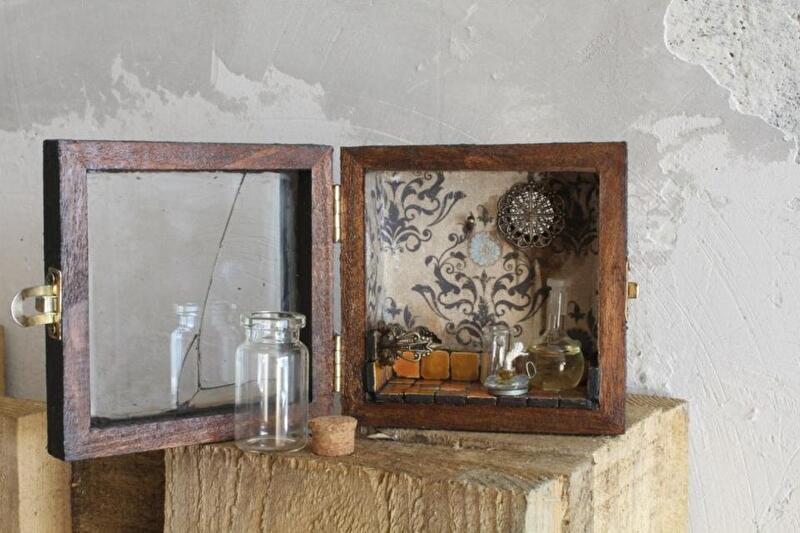 Именно корпус часов — нет. Была возможность отработать некоторые приемы на коробке для ювелирки «Химический вытяжной шкаф». Там обыгрывается образ вытяжного шкафа викторианской эпохи: маленькие склянки, колбы, спиртовка, керамическая плитка. Все настоящее, пластиковых имитаций там нет. Пришлось даже стекло разбивать, чтобы соответствовать духу старины!