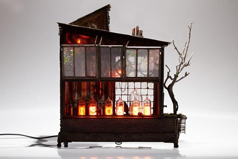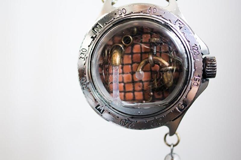 Пришлось много работать со стеклом, перевела целую пачку просроченного новокаина, чтобы научиться от ампул отрезать идеально ровные верхушки. Дублирующую колбу на секундах вообще пришлось заказывать у стеклодува из Украины, а керамическую плитку 3×3 мм из Германии. Дерево-корень откопала на просторах Испании. Это был некий квест: «Собери сокровище сам»!