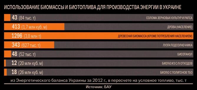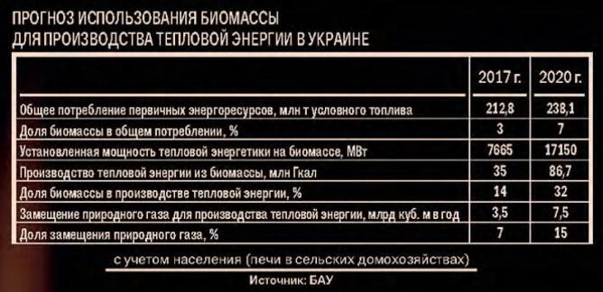 По расчетам специалистов, с учетом географии размещения котельных в населенных пунктах и затрат на логистику, биомасса способна заместить производство 10,5 млн Гкал (или треть от потребности). По данным Гелетухи, на сегодняшний день вся тепловая энергия, производимая из биомассы в Украине, уже эквивалентна объему тепла, на производство которого ежегодно требовалось бы 1,6 млрд куб. м природного газа: «Иными словами, если бы население не сжигало эту биомассу (т. е. дрова) в печах и котлах, нам потребовался бы дополнительный объем газа в указанном размере. По нашим расчетам, до 2020 г. есть реальная возможность ежегодно замещать биомассой еще до 6 млрд куб. м природного газа».