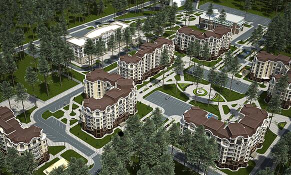 Территория комплекса: вокруг ЖК сосновый лес, в 15 минутах езды Киевское море