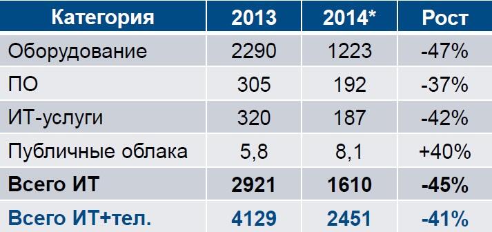 Тогда аналитики компании IDC прогнозировали, что по итогам года падение рынка составит 25%, при условии, что появится политическая стабильность, начнутся реальные реформы, поступит международная финансовая помощь. Сегодня, учитывая многократное ухудшение политической и экономической ситуации в стране, в IDC прогнозируют, что ИТ-рынок закроет 2014 год с 45-50%-м падением (без учета телефонии), причем наиболее сильно пострадают продажи оборудования.