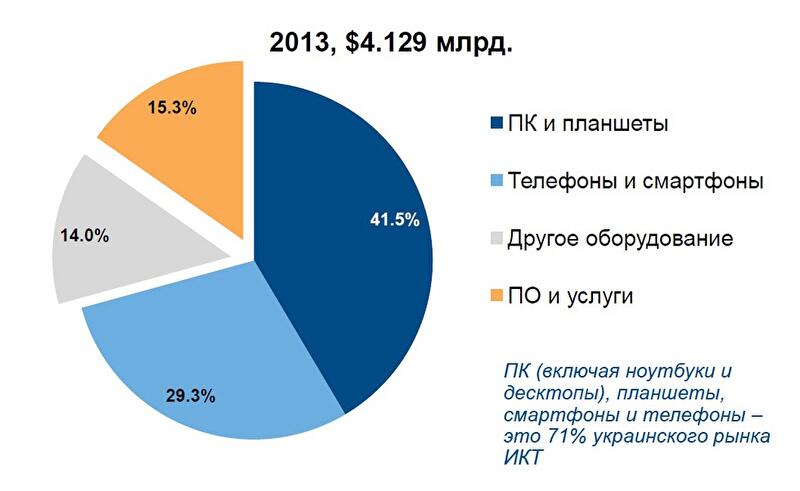 Технологическая отсталость Украины во многом объясняется непропорциональной структурой рынка ИТ. В то время как в развитых странах, таких как США и Германия, вес главных сегментов рынка (оборудование, программного обеспечение (ПО) и ИТ-услуги) распределяется равномерно, на каждый сегмент приходится порядка трети рынка ИТ, в Украине налицо перевес рынка поставок оборудования. По оценкам аналитиков IDC, на оборудование приходится больше 80%, на рынок ПО и ИТ-услуг – чуть больше 15%