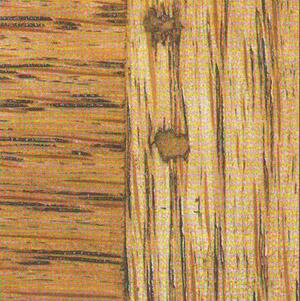 В этом случае вы сможете более точно сымитировать цвет древесины. Чтобы окрасить заплату, нанесите на всю поверхность первый слой окончательной отделки (грунтовку), чтобы увидеть тот цвет, которого вы хотели добиться. Когда грунт высохнет, изобразите на заплате текстуру древесины и фон, соответствующий самому светлому оттенку окружающей древесины. Можно ножом нацарапать на заплате рисунок древесных волокон, чтобы сымитировать такие породы дерева с ярко выраженной текстурой, как дуб, красное дерево или грецкий орех. Лучше всего сначала нарисовать текстуру дерева тонкой художественной кистью, а потом наложить фон древесины. В противном случае заплата будет слишком темной. После нанесения рисунка с имитацией текстуры дайте ему высохнуть и нанесите тонкий слой защитного покрытия. Затем наложите фоновую окраску. В качестве красителя лучше всего использовать разбавленный масляный лак, в который добавлен какой-нибудь растворимый в масле пигмент.