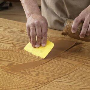 Надо избегать всякой неряшливости. Не забывайте, что связующее в шпаклевке для дерева представляет собой лак, клей или алебастр. Оно будет прилипать к любому участку древесины, на котором окажется, и препятствовать проникновению в него морилки, порождая пятнистость.