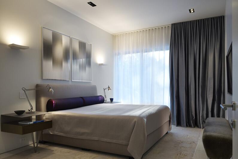 Обладателям спальни, чей интерьер выстроен контрастными сочетаниями цветом, рекомендуем следовать этому правилу и в случае с подбором штор.