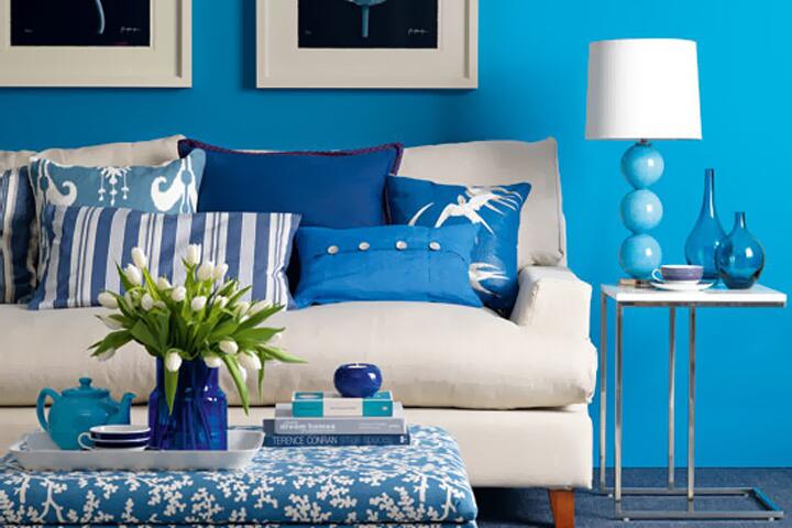Синий цвет подходит практически любой комнате, главное правильно подобрать его оттенок. Для небольших комнат синий лучше сочетать с белым. В таком случае хороша синяя мебель, а стены и потолок - это белый фон. Оттенки близкие к голубому и бирюзовому очень хорошо смотрятся в сочетании с кремовым и ванильным, с цветом топленого молока. Глубокий синий цвет в интерьере придаст помещению таинственности. Очень хорошо синий сочетается с деревом и как с цветом и как с материалом.