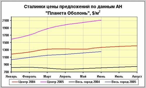 По данным агентства недвижимости «Планета Оболонь» индекс стоимости жилья в мае 2005года составил 1036.9$/кв. м. (+4.78% за месяц)