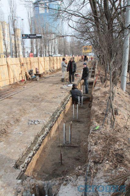 Сейчас же стройплощадку, от центрального входа в ботсад и до памятника Щорса, оградили двухметровым зеленым забором, оставив два метра пешеходной зоны. На самой стройплощадке работает несколько десятков строителей: трое из них при помощи спецтехники (небольшой буровой машины) заканчивают забивать восьмиметровые сваи (всего более двухсот), а другие копают траншею. Рядом со стройкой валяются кирпичи от старой ограды.
