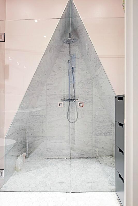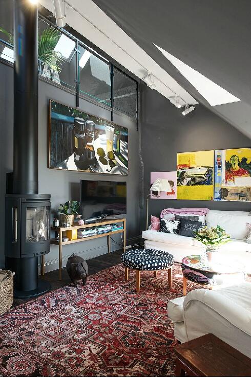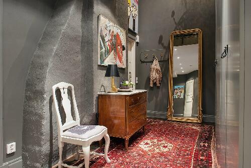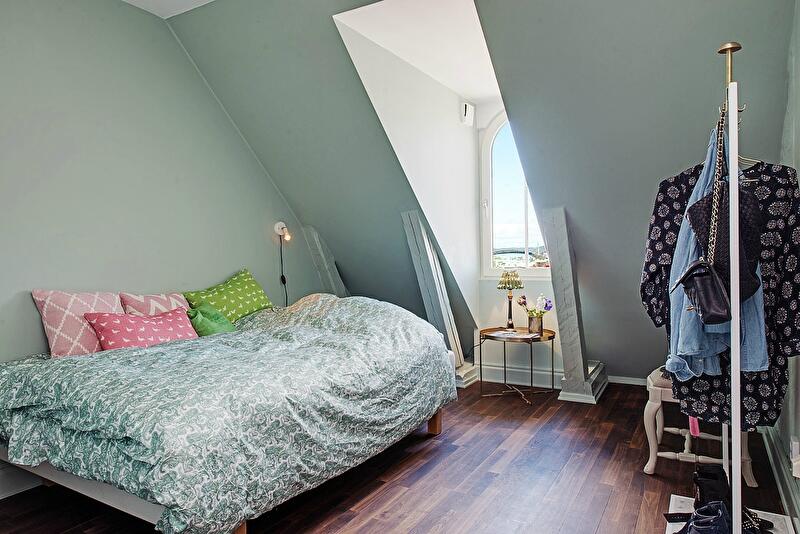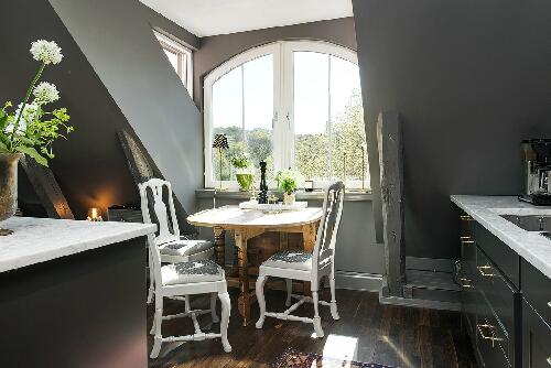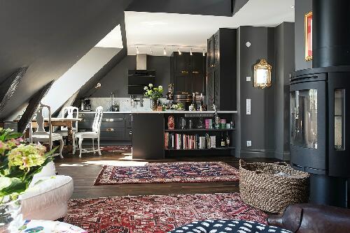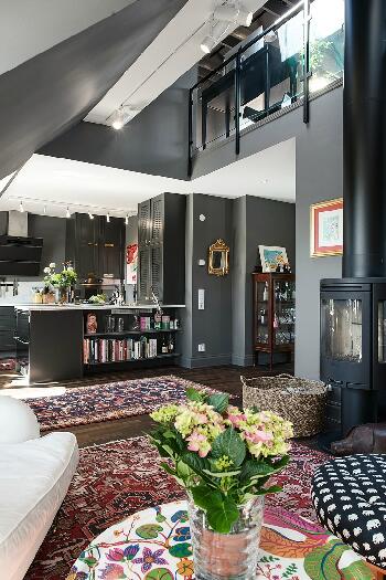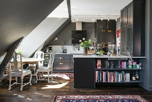 Мы уже привыкли к тому, что обычно в шведских квартирах стены и потолок белоснежные. Но на то они и правила, чтобы их нарушать. Данный двухуровневый лофт в Гетеборге привлек наше внимание, прежде всего, потому, что картина домашнего уюта в скандинавском стиле написана здесь на эффектном темно-сером фоне: в этот цвет выкрашены не только стены, но и двускатный потолок. Мало того, даже кухонную мебель удалось подобрать точно такого же тона.