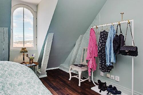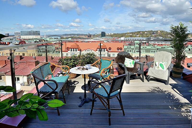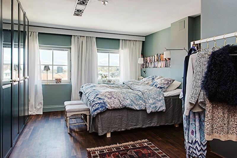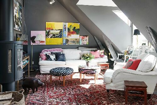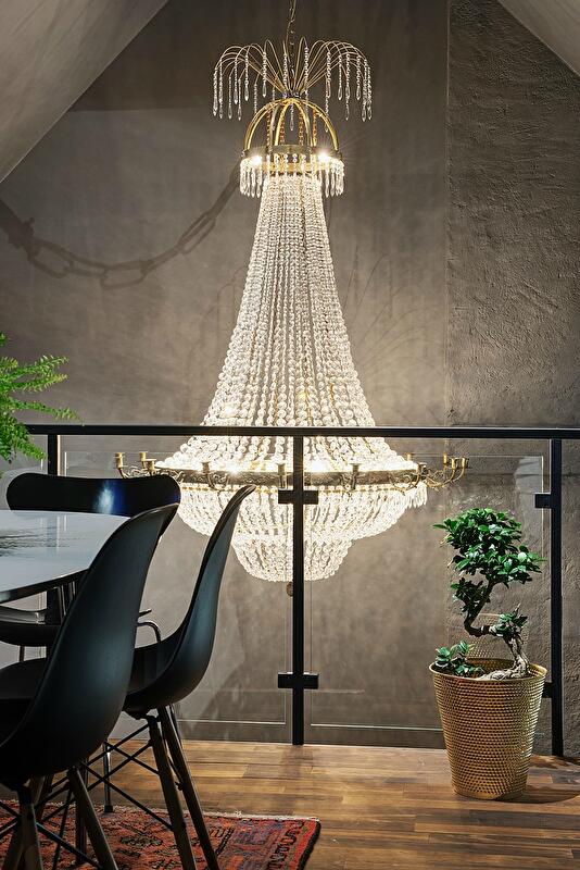 Просто удивительно, насколько органично в этом пространстве смотрятся и яркие произведения contemporary art, и огромная помпезная хрустальная люстра, и зеркала в золотых рамах, и коврики с традиционными рисунками, и винтажные вещи, и минималистская дизайнерская мебель, и красочный текстиль. Дополнительный шарм интерьеру придают двускатный потолок, деревянные балки, арочные окна и темный паркет. Кроме прочего, в распоряжении жителей этих апартаментов – терраса площадью около 19 кв. м, откуда открывается потрясающий вид на город.