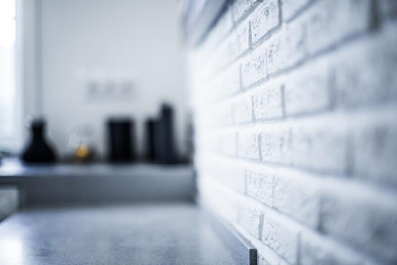 Несмотря на размеры, мы собрали в этой маленькой кухне богатую коллекцию фактур, которая может напомнить о стилистике лофта. Пол выложен плитами керамогранита «под металл». Одну из стен мы облицевали декоративным кирпичом, фартук оформили с помощью глянцевой плитки «кабанчик» – даже при стандартной раскладке, которая похожа на кирпичную стену, этот материал выглядит свежо и ярко, скошенные фаски создают дополнительные блики. Остальные участки стен мы просто покрасили влагостойкой краской.