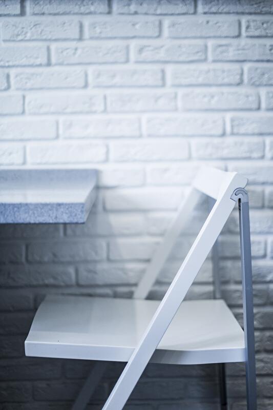 Остальная мебель в кухне, помимо гарнитура, очень компактная — для экономии места мы использовали складные стулья Calligaris и складной стол. Дизайн лаконичный, материалы натуральные, цвета – серый и белый, под стать всему интерьеру.