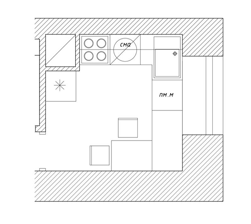 Ее не было. Стояк в углу слева от входа мы не переносили, вход оставили на месте. Нужно было работать с имеющимся объемом – площадью менее чем 7 квадратов, с одним окном. Важно было эргономично расположить все необходимые предметы в этом ограниченном пространстве.