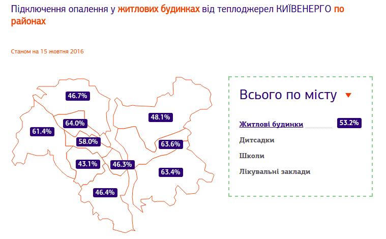 Як стало відомо Domik.ua на ранок 15 жовтня теплом забезпечено вже 53% осель киян, або понад 5 тис. будинків. «Найбільше будинків підключено до тепла у Дарницькому та Шевченківському районах міста. Соціальна сфера підключена майже повністю. Тепло вже є у 98% столичних дитсадків, 96% шкіл та 92% лікарень (512, 443 та 259 о’бєктів відповідно)», - повідомили в «Київенерго».
