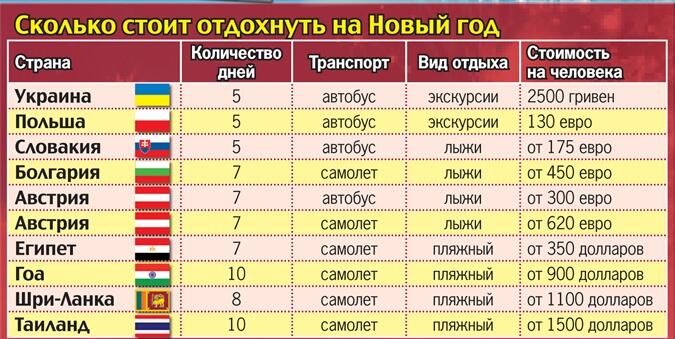 Например, поездка на Новый год на Шри-Ланку будет стоить минимум 1100 долларов за восьмидневный тур с вылетом 29 или 31 декабря. В то же время двухнедельную путевку с 5 января можно найти за те же 1100 долларов на человека. То есть в пересчете на дни отдых будет стоить чуть дороже египетского. Чуть дешевле стоит отдых в Индии. Десятидневная путевка на Гоа с вылетом 25, 27 или 29 декабря обойдется в 900 долларов на человека.