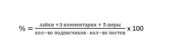"Если с первыми двумя всё достаточно просто и понятно — данные предоставляются внутренними службами статистики социальных сетей автоматически, то вовлечение мы считаем сами. Вовлечение в процентном соотношении показывает уровень того, насколько вашим брендом интересуются и участвуют в его жизни в социальных сетях. Мы для расчётов используем такую формулу: