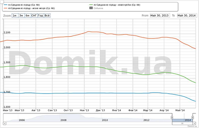 График №1. Средние цены предложений по всем объектам вторичного рынка недвижимости Киева, в новых домах и в домах возле метро.