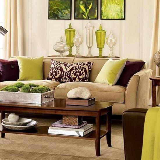 Сочетание зеленого и фиолетового в интерьере гостиной