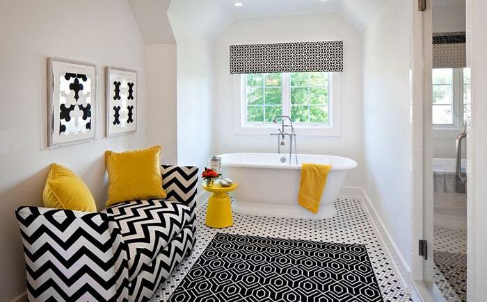 Эксперименты можно начать не с полной смены цветовой гаммы, а с простых акцентов. Чёрно-белая ванна станет отличным местом для проявления фантазии и креативности при подборе жёлтых элементов. В этом случае даже простая пара жёлтых полотенец может полностью изменить атмосферу. Жёлтая акцентная стена, стул – подойдёт любой вариант. Нужно лишь помнить, что для симметричного и элегантного вида цвет нужно использовать в нескольких местах.