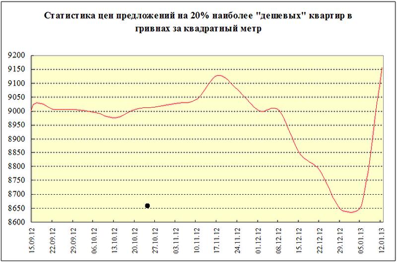 Статистика цен предложений в 20% наиболее «дешевых» квартирах за последние три месяца выросла на 1,5%; за последнюю неделю выросла на 5,7%. Такой резкий рост статистики цен объясняется существенным изменением состава предложения в данном сегменте рынка.