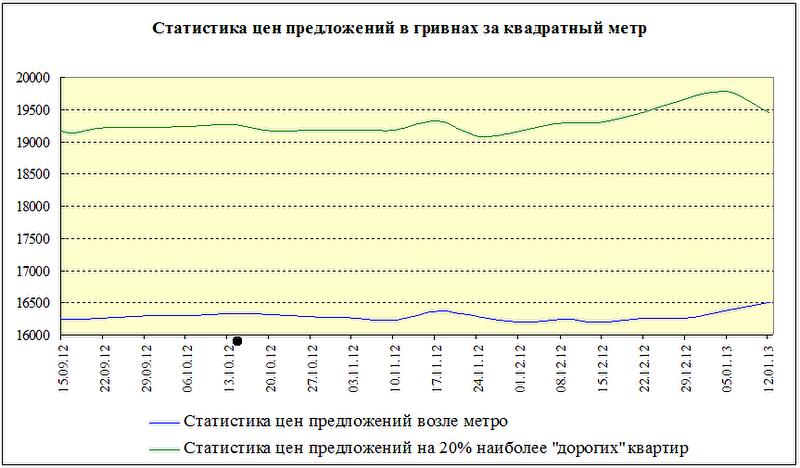 График №3. Изменение статистики цен предложений в гривнах за квадратный метр на 20% наиболее «дорогих» квартир, а также в квартирах возле метро