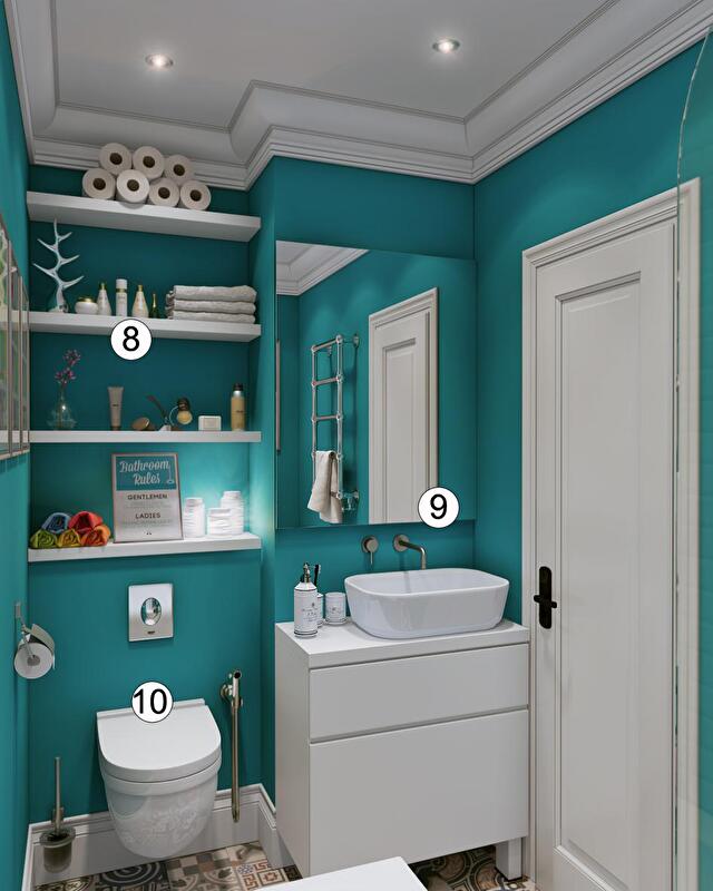2. Хотя размеры и форма помещения оставляла желать лучшего, мы все же рискнули применить на стенах насыщенный цвет. Глубокий и бархатистый оттенок бирюзы сделал ванную более уютной и интересной. Кроме того, подобный цвет напрямую ассоциируется с водными глубинами.