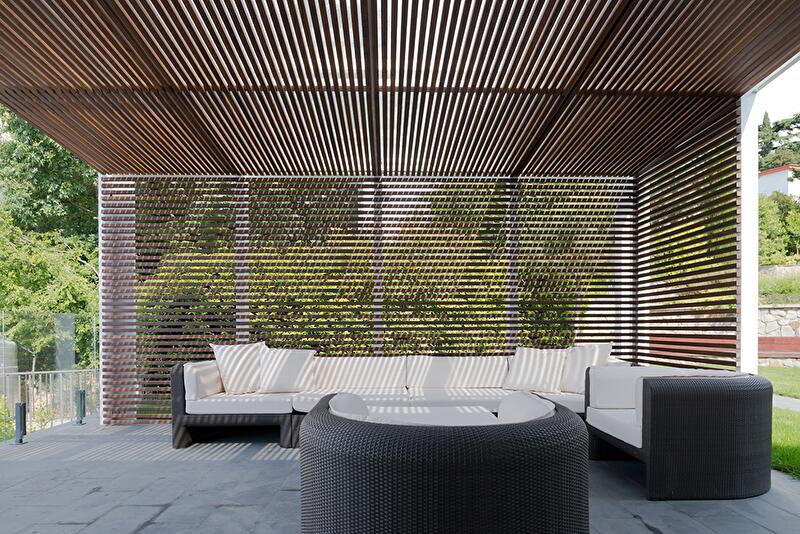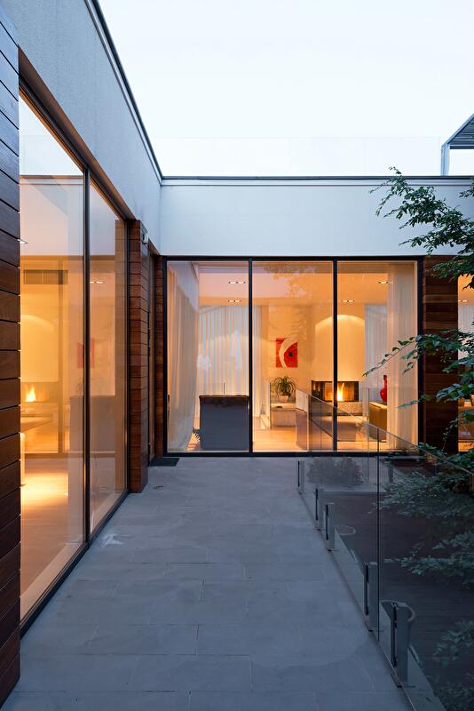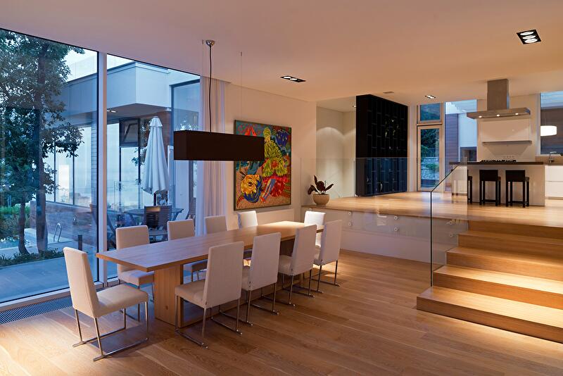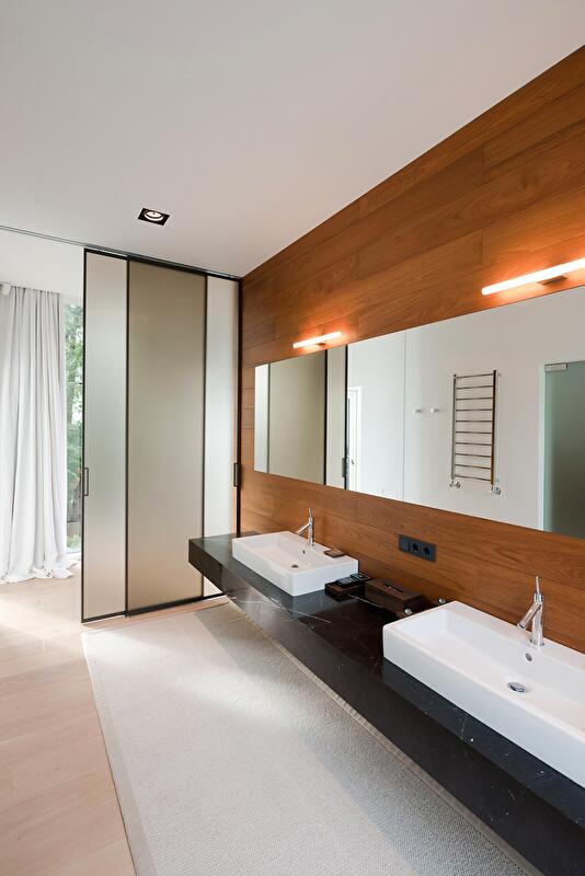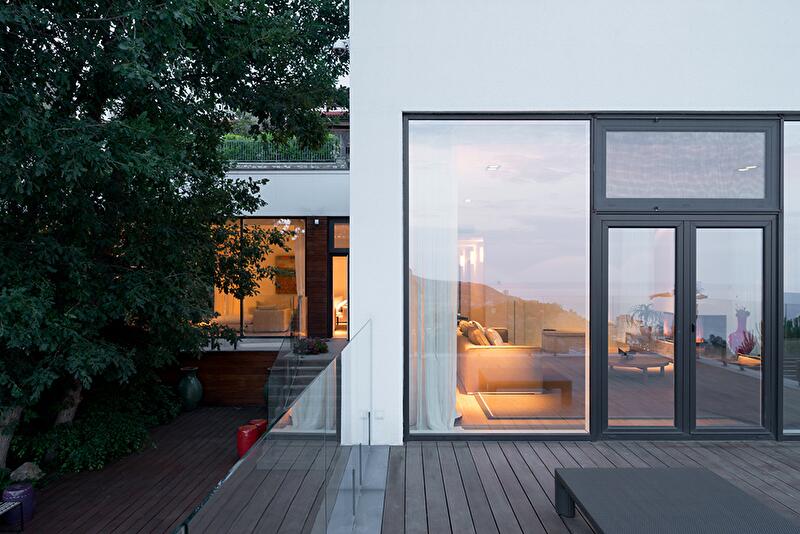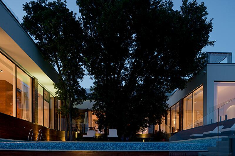 Значительный уклон рельефа и желание сохранить старый дуб определили сложную архитектуру здания. Это не дом-кубик, ясный и понятный, с каждой стороны он выглядит по-новому. Постройка располагается террасами, а все уровни связаны между собой как снаружи, так и внутри. На самом верху спроектирован гараж, спускаясь от которого попадаешь на кровлю, засыпанную белой мраморной галькой, где устроена терраса для отдыха и занятий йогой. Дальше следует первый жилой уровень, представленный гостиной, каминной, гостевой, кухней и главной спальней. Уровнем ниже дом делится на два крыла, в которые ведут лестницы. В одном из них находится спа (хамам, просторные душевые, комнаты для отдыха и различных процедур), а также детская игровая и гостевые спальни. В доме есть даже винная комната, где поддерживается оптимальный температурный режим. Другое крыло полностью отдано детям. На самой нижней террасе располагается бассейн.