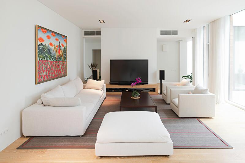 Территория со сложным рельефом и большим количеством деревьев включая огромный многовековой дуб, который теперь находится в центре композиции, предопределила П-образный план резиденции. В проекте выдержана единая стилистика и преемственность материалов, создана максимально простая обстановка, ведь открывающаяся из огромных окон панорама другого и не требовала. Стены и потолок в доме выполнены в белом цвете, пол выложен из дубовой доски, а мебель выбрана лаконичных форм от хороших итальянских марок — ничего лишнего. Яркий цвет присутствует только в картинах. Красота окружения — дом стоит на холме, внизу простираются виноградники и море — уравновешивает этот аскетизм.
