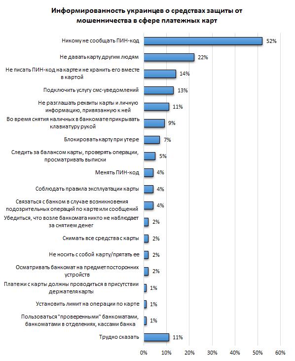 Согласно данным исследования, 11% пользователей платежными картами не смогли назвать ни одного способа защиты, а остальные респонденты отметили, что им известны всего 1-2 способа защиты от мошенничества. При этом основные названные способы защиты были традиционными: 52% опрошенных знают о необходимости не сообщать никому ПИН-код карты; 22% – не передавать карту другим людям; 14% – не хранить ПИН-код вместе с картой, в том числе, не писать его на карте.