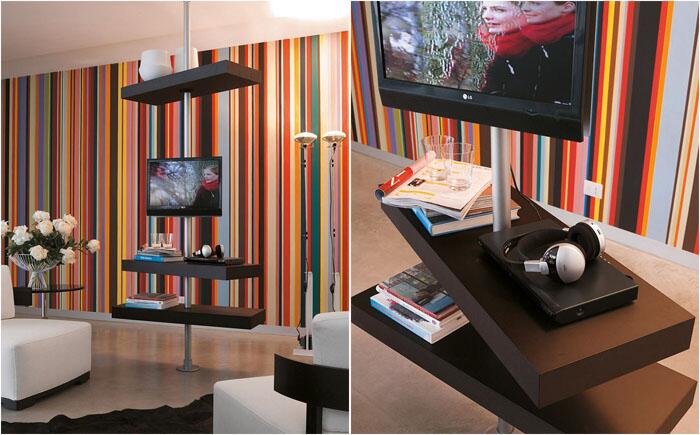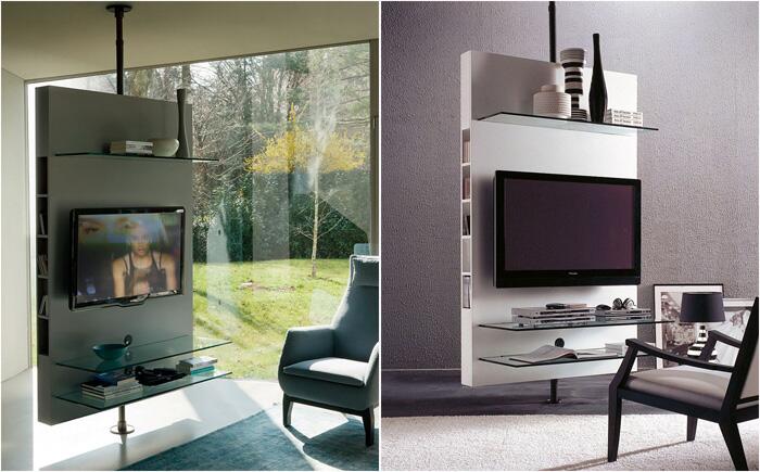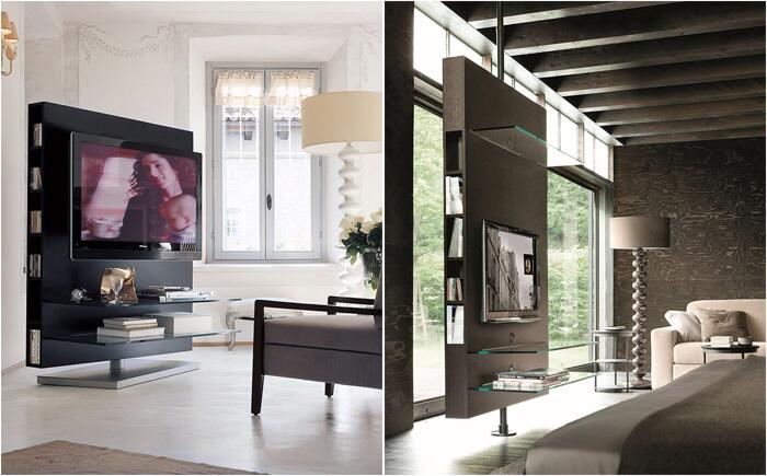 «Медиа центр» «Медиа центр» - простой, но красивый дизайн, полностью соответствующий названию модели. В нём предусмотрено место не только для телевизора. По сути это оригинальный стеллаж, который можно использовать как в гостиной, так и в спальне. Изюминка заключается в том, что деревянная панель вращается, поэтому телевизор можно смотреть из любой точки комнаты.