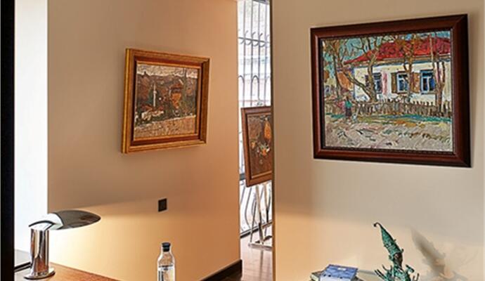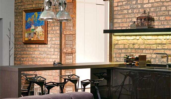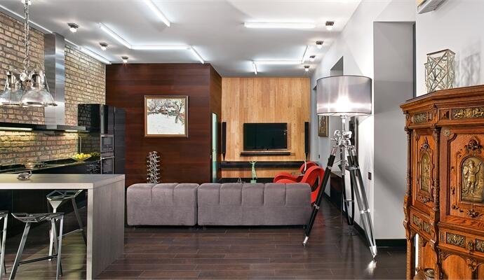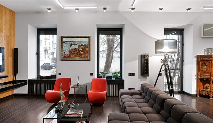 Впрочем, радикальный подход не коснулся старых вещей — антикварных фарфоровых часов или внушительной коллекции советской живописи, которым заведомо отвели роль главных героев пространства, в полной мере осознавая их физическую и метафизическую ценность. Раритеты сыграли на контрасте с современными дизайнерскими предметами (барные стулья и ярко-оранжевые кресла Magis, диван B & B Italia и др.). И все это — на фоне правильных декораций: после снятия штукатурки обнажились красивая кирпичная кладка и старые фактурные металлические швеллеры. На контрасте с аутентичными фактурами сыграла нестандартная отделка стен: паркет из массива венге и золотистого дуба.