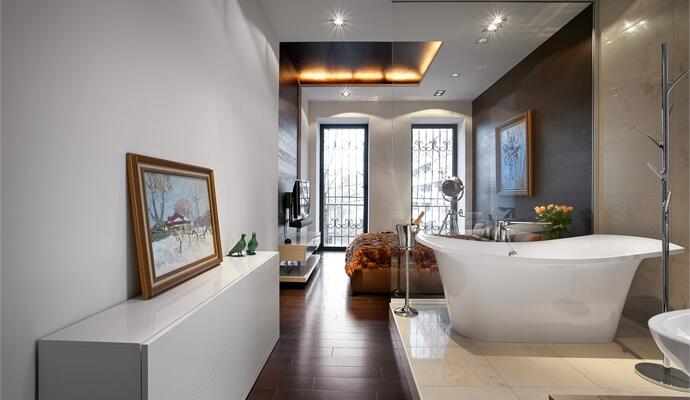 Паркетная доска на стене? — запросто! Игра в тетрис на потолке из обычных люминесцентных ламп? — почему бы и нет? Объединение спальни и ванной? — это в Европе давно актуальный тренд! Антикварный шкаф рядом с дизайнерским светом? — идеальное сочетание и не менее яркая тенденция! В этой квартире работы Сергея Махно есть все, а главное — смелость микшировать, на первый взгляд, несовместимые вещи.