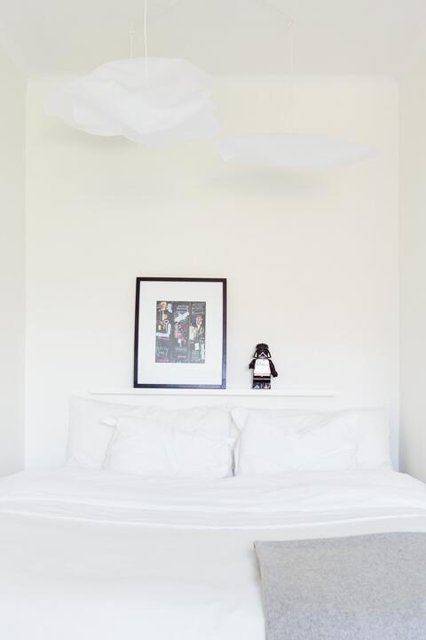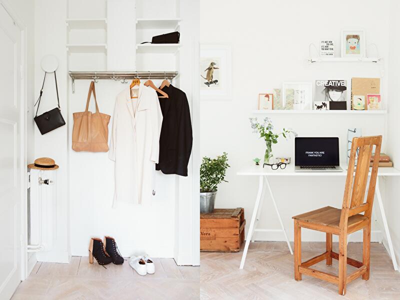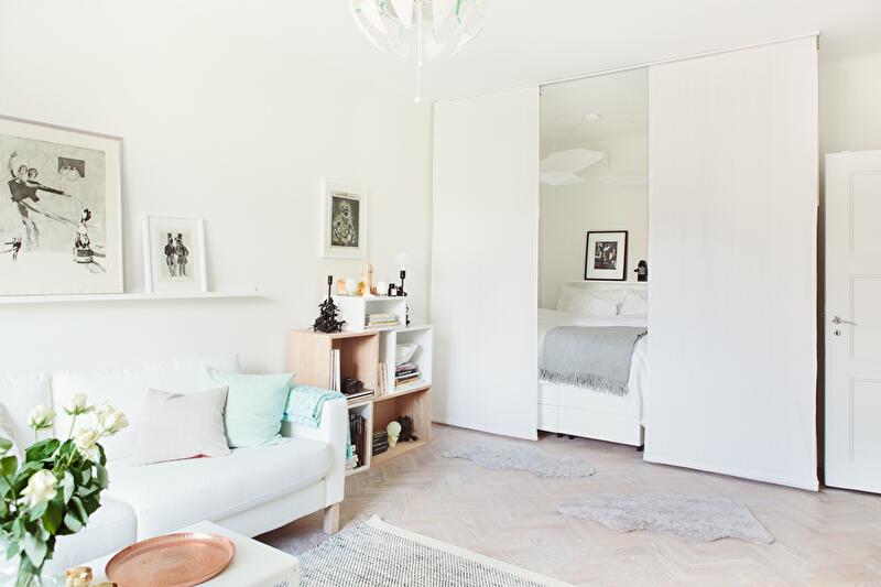 Квартира площадью 45 кв.м. Хозяева захотели оставить как можно больше свободного пространства. Поэтому кровать спрятали за раздвижные двери.