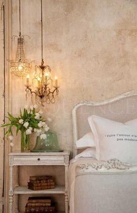 Ну и последний секрет заключается в декоре . Замечательно подчеркивает стиль прованс керамика: изящные статуэточки, нежные вазочки, настенные тарелочки. Псевдо-камин из светлого или окрашенного камня станет настоящей «изюминкой» интерьера, а искусственно-состаренные парные тумбочки у кровати придадут ему гармонии и единства. Также не стоит забывать о фотографиях в красивых, ажурных рамочках и всевозможных текстильных украшениях.