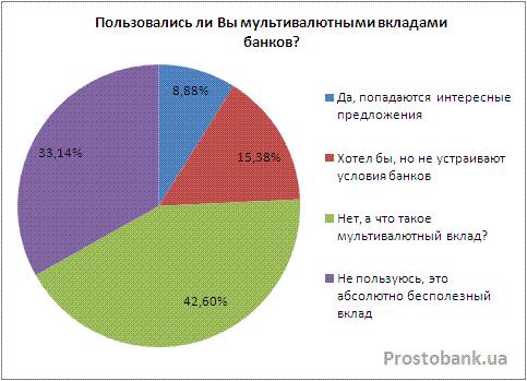 Интересно, что вместе с увеличением предложения растет и интерес вкладчиков к мультивалютным вкладам. Так, по результатам опроса, проведенного на портале Prostobank.ua год назад, менее 9% читателей, ответивших на вопрос, пользовались мультивалютными вкладами, и еще около 15% участников опроса интересовались такими вкладами, но не нашли подходящих для себя условий.