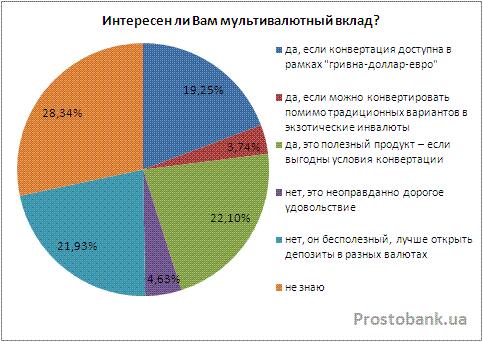 А уже по результатам другого опроса, проведенного на сайте Prostobank.ua в 2012 году, более 45% читателей, принявших участие в опросе, интересуются мультивалютными вкладами. При этом для 22% проголосовавших важны выгодные условия конвертации, а более чем для 19% - возможность конвертации между гривной, долларом и евро.