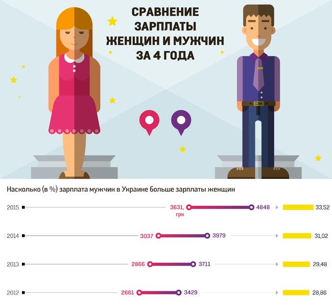 В частности, женщины в Украине по итогам прошедшего года получали в среднем 3631 грн, в то время как мужчины — 4848 грн (средняя зарплата на одного штатного работника; выборка по предприятиях, у которых в штате — больше 10 человек).