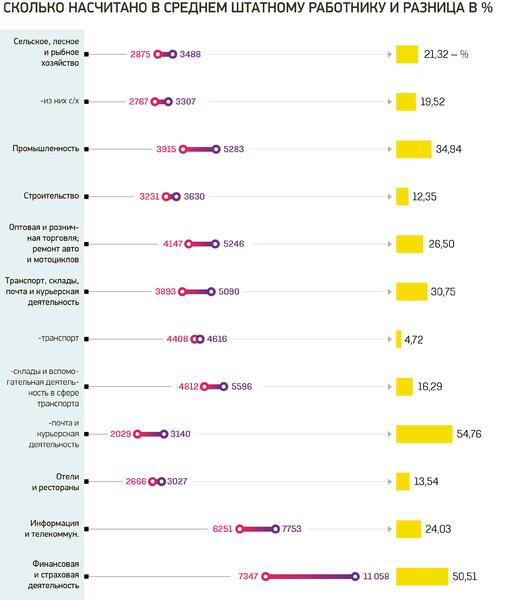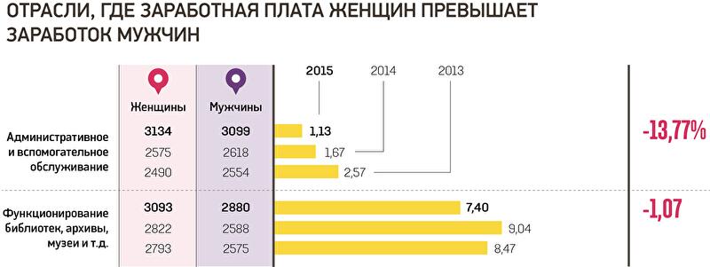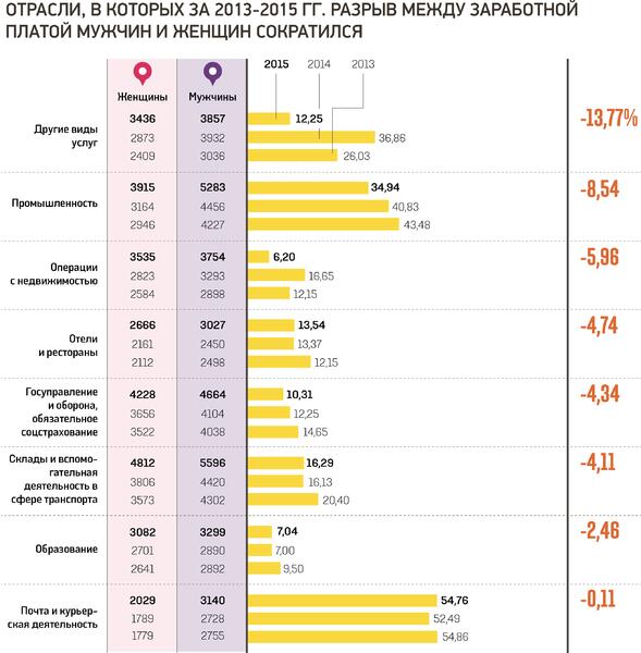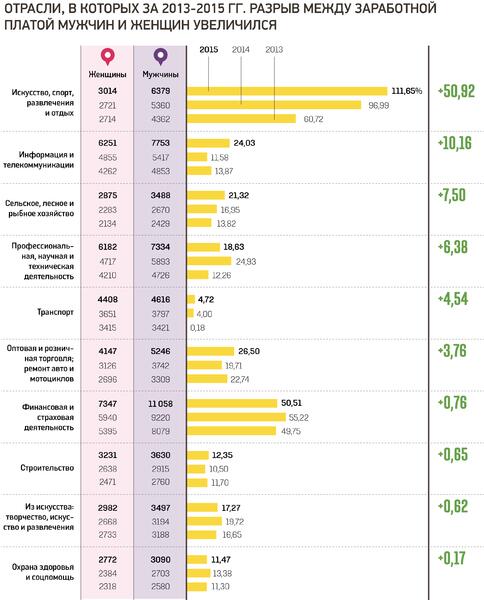 Во многих отраслях за последние два года разрыв между "мужской" и "женской" заработной платой увеличился. В частности, в сфере искусства, спорта, развлечения и отдыха разница выросла с 60,7% в пользу мужчин по итогам 2013 г. до 111,6% по итогам 2015 г., на 50,9%. В информации и телекоммуникациях — на 10,16% (с 13,9% до 24,03%). А в сельском хозяйстве — на 7,5: (с 13,82% до 21,32% по-прежнему в пользу мужчин).