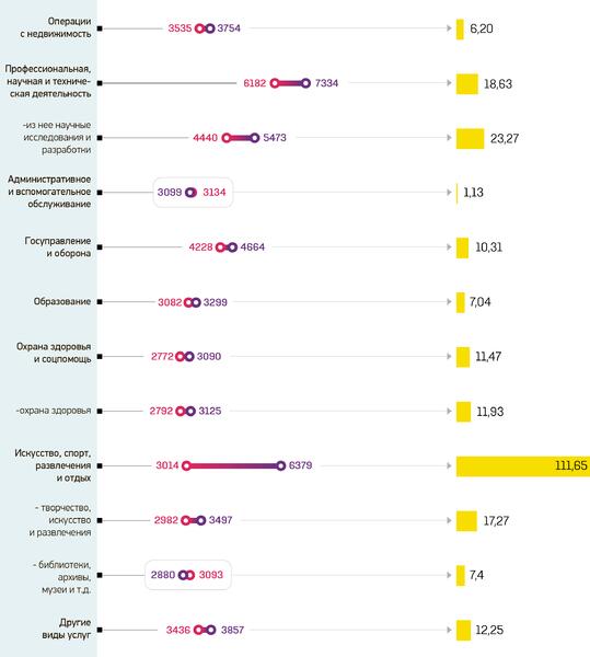Зарплата дам превышает мужскую только в двух сферах — административное и вспомогательное обслуживание (на 1,13%) и функционирование библиотек, музеев, архивов (на 7,4%).