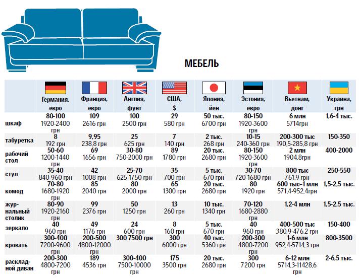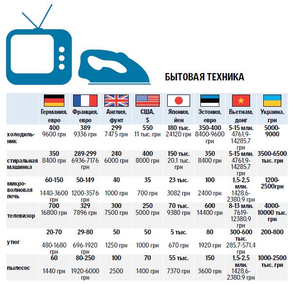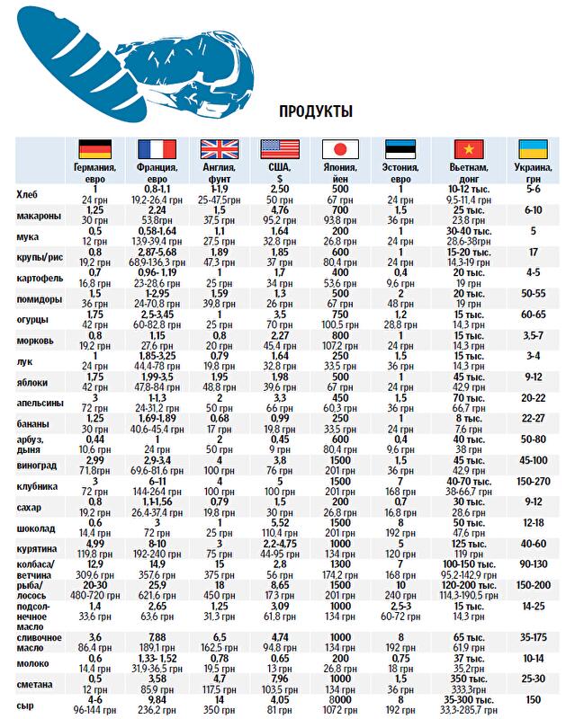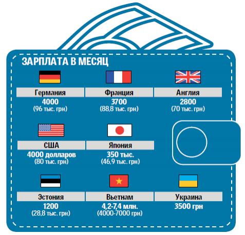 ДОХОДЫ. Баланс расходов-доходов в разных странах мира, понятное дело, неравномерен. Согласно нашему опросу жителей Европы и Азии, выяснилось, что больше всего получают в Германии и Франции — здесь средняя зарплата оценивается в 96 и 88,8 тыс. грн в месяц соответственно. А вот в Японии и Эстонии заработки на порядок ниже — около 46,9 и 28,8 тыс. грн. И, наконец почти в два раза больше украинцев, со средней зарплатой в 3500 грн в месяц, получают жители Вьетнама — около 4—7 тыс. грн каждый месяц. Что касается ценовой политики за рубежом, то всюду традиционно доступны продукты питания, а вот стоимость крупной быттехники и мебели частенько кусается.