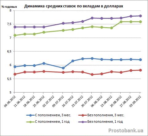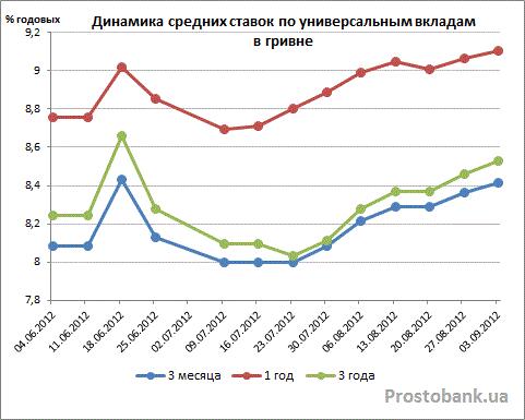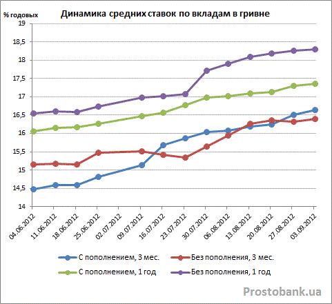 Однако рост этот уже не был таким стремительным. В частности, если по вкладам в гривне рост средних ставок в июле-2012 составлял, в зависимости от срока и возможности пополнения, 0,7-1,2 процентного пункта, то в августе-2012 он уже ограничивается показателями в 0,34-0,56 процентного пункта.