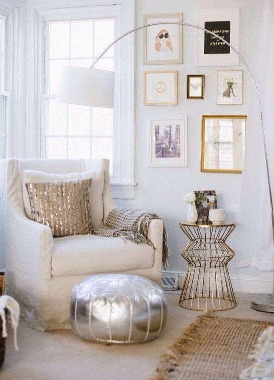 Само собой, что металлический эффект нужно дозировать: слишком много стали или золота в интерьере будет выглядеть гротескно и безвкусно. Небольшие детали, напротив, станут изюминкой, яркой особенностью вашего дома. К примеру, золотые рамки на стенах, перекликающиеся с подушками с эффектом металлик и кофейным столиком, выгодно оттенят одноцветное оформление в белом или сером цвете.