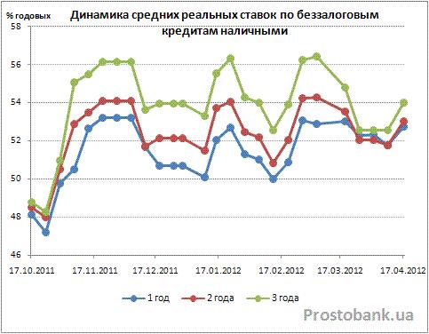 В результате, в последние шесть месяцев средние ставки по кредитам на год по исследованиям компании «Простобанк Консалтинг» колеблются в диапазоне от 50% до 53% реальных годовых, среднерыночная стоимость двухлетних кредитов «мечется» между отметками 51% и 54% реальных годовых, а трехлетние кредиты движутся в коридоре 52%-56% реальных годовых.