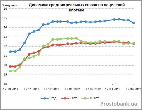 Правда, с начала апреля средняя реальная стоимость нецелевых ипотечных кредитов начала понемногу снижаться, и по исследованиям компании «Простобанк Консалтинг» на 17.04.2012 г. снижение по сравнению с концом марта-2012 составило 0,2-0,4 процентного пункта или около 1%-1,5% от начального значения.
