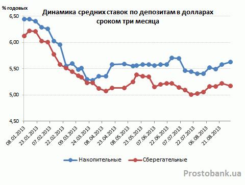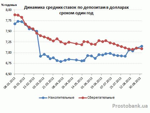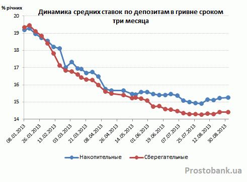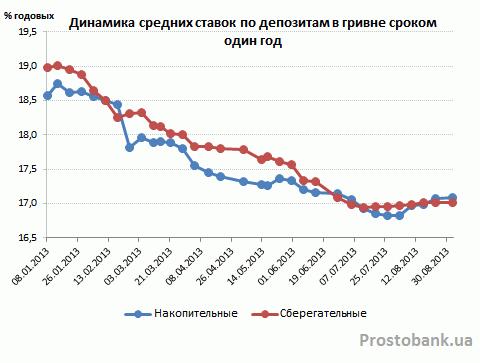 В последний месяц лета среднерыночные ставки по гривневым депозитам впервые с начала года прекратили снижение. И если ранее среднемесячные темпы снижения ставок по вкладам в гривне составляли 0,1-0,5 процентного пункта в зависимости от срока депозита, то в августе-2013 доходность гривневых депозитов даже немного увеличилась.