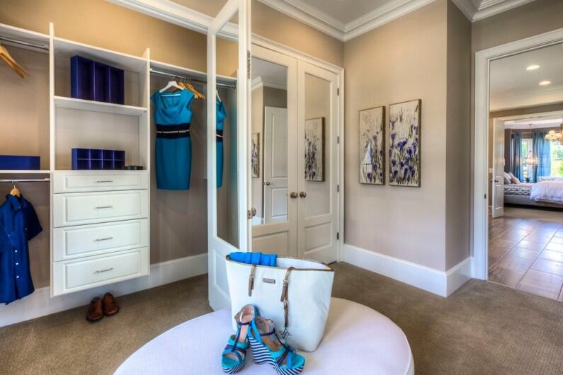 Стеклянная мебель, в не меньшей степени, нежели зеркальная, может отражать свет, но она же способна его пропускать, что очень удобно в случае с двумя смежными комнатами, одна из которых – без окон. К примеру, частью стены между спальней и гардеробной можно сделать легкий полупрозрачный стеллаж для хранения декоративных вещей. Свет в гардеробной, исходящий от вмонтированных спотов или подвесного светильника, обязательно отразится в стеклянных полочках и, благодаря этому, умножится.