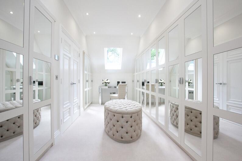В спальнях, прихожих, коридорах, ванных комнатах зеркала используются в фасадах напольных и подвесных шкафов, очень часто они занимают всю внешнюю поверхность дверей, чтобы человек смог рассмотреть свой образ во весь рост.