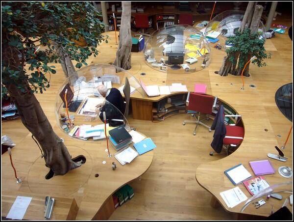 В шумном многолюдном офисе, где в одном большом помещении работает одновременно несколько десятков человек, очень трудно сосредоточиться. И людям, имеющим несчастье там трудиться, так и хочется оказаться под собственным куполом , непроницаемом для других. А в совместном офисе парижских компаний Pons и Huot такая возможность, действительно, представлена каждому сотруднику.