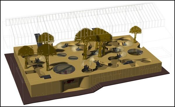 Но все это, то есть рабочие места с куполами и ходы, расположено на втором уровне офиса, находящемся непосредственно в атриуме. А попасть в него можно только с первого уровня, где находятся комнаты отдыха и залы для переговоров, гардеробы, туалеты, кухня. Оба этих уровня связаны между собой множеством переходов, лестниц, отверстий. В итоге создается сложная система, одновременно и разделяющая людей, и объединяющая их.