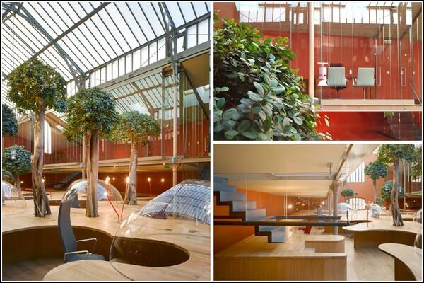 Ну а крыша этого здания полностью стеклянная. Это позволяет большую часть рабочего дня иметь в помещении максимально естественное освещение. Ведь оно полезно и для людей, работающих в этом офисе, и для множества деревьев, растущих там. Наличие последних также обусловлено стремлением создать сотрудникам компаний Pons и Huot ощущение комфорта. Ведь среди этой растительности они будут себя чувствовать в саду, а не в старом здании в центре Парижа.